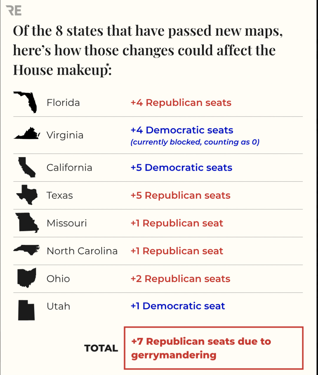 Now if we’re going to talk purely about numbers ahead of the midterms, blue states can play this game too. California and Virginia have redrawn their maps in response to Texas starting all of this (with the caveat that California and Virginia put the redistricting referendum to statewide vote, rather than just having the governor cram the new maps down people’s throats). So before Louisiana’s latest move, the nationwide redistricting games were set to net roughly seven House seats for Republicans: