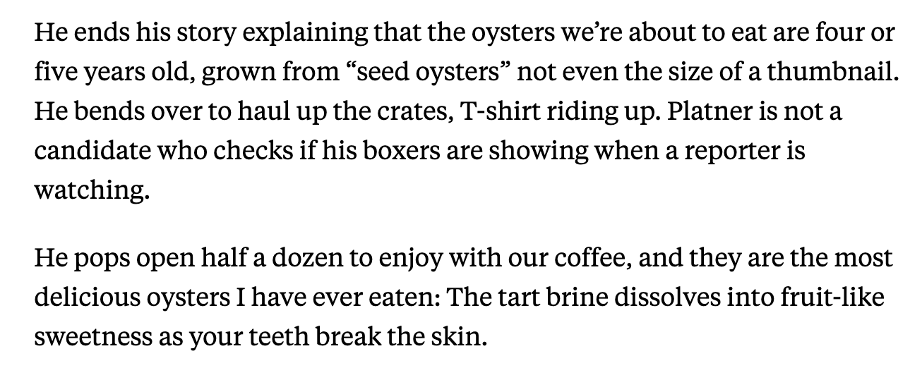 Optics matter in politics, unfortunately. And in this case, Platner has also made enough offensive comments and has enough deeply concerning shit on his resume that we risk being stuck with another John Fetterman wacko on our hands. So unfortunately, it may be time to say goodbye to our Oyster Daddy, even as we take important lessons from him about about how to talk to voters without sounding like a douchebag.