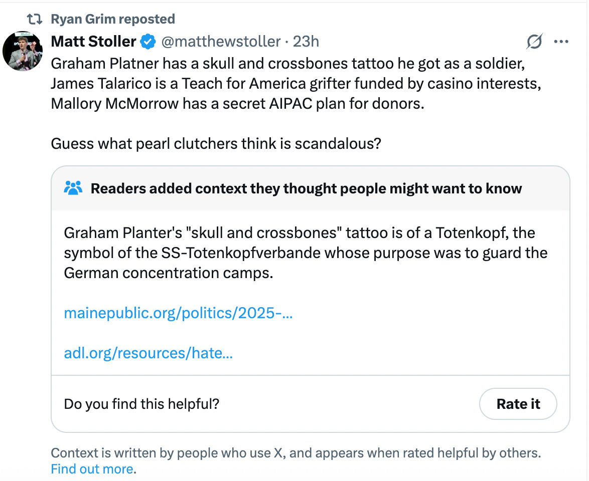 I do believe Platner when he says that back in 2007, when he was drunk with his soldier buddies and all hopped up on testosterone and adrenaline, he did not pick out an SS symbol thoughtfully and on purpose. I also think the Democrats simply can’t be a party that tolerates former Blackwater mercenaries and Nazi chest tats right now, period, or any fascist symbolism we try to call out in Republicans—including that literal Sieg Heil by Elon Musk on stage or Pete Hegseth’s white Christian nationalist tattoo—will be met with “your guys have them, too.” Even when young Republicans literally say “I love Hitler” in their private texts to each other, our outrage will be neutered by the fact that we let a guy with a Nazi tat run for Senate.