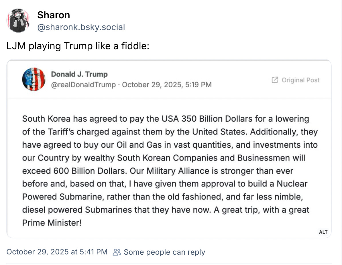 Barely a week after Trump posted an AI video of himself dumping shit from an airplane all over protesters at the No Kings rally on October 18, President Lee Jae Myung has gifted Trump a replica of a gold crown believed to have been worn by an ancient Korean ruler. The gift by appears, on its face, to be a kind of pathetic way to get Trump to lower tariffs on South Korea: by prostrating themselves before a corrupt narcissist who demands flattery and literal gold in exchange for favors. That said, it’s also pretty pointed to give a fake crown to a rival president who is currently trying to deny that he’s a monarch—in the process, splashing photos across international media of Trump gazing at this stupid large, Burger King-ass crown—amid a “No Kings” rally that was the biggest single-day protest the United States has ever seen. And the photos definitely highlight the irony of South Korea having managed to impeach, remove, and arrest its own Trumpian dictator for declaring martial law and attempting a self-coup, while ours just continues to fester in power.