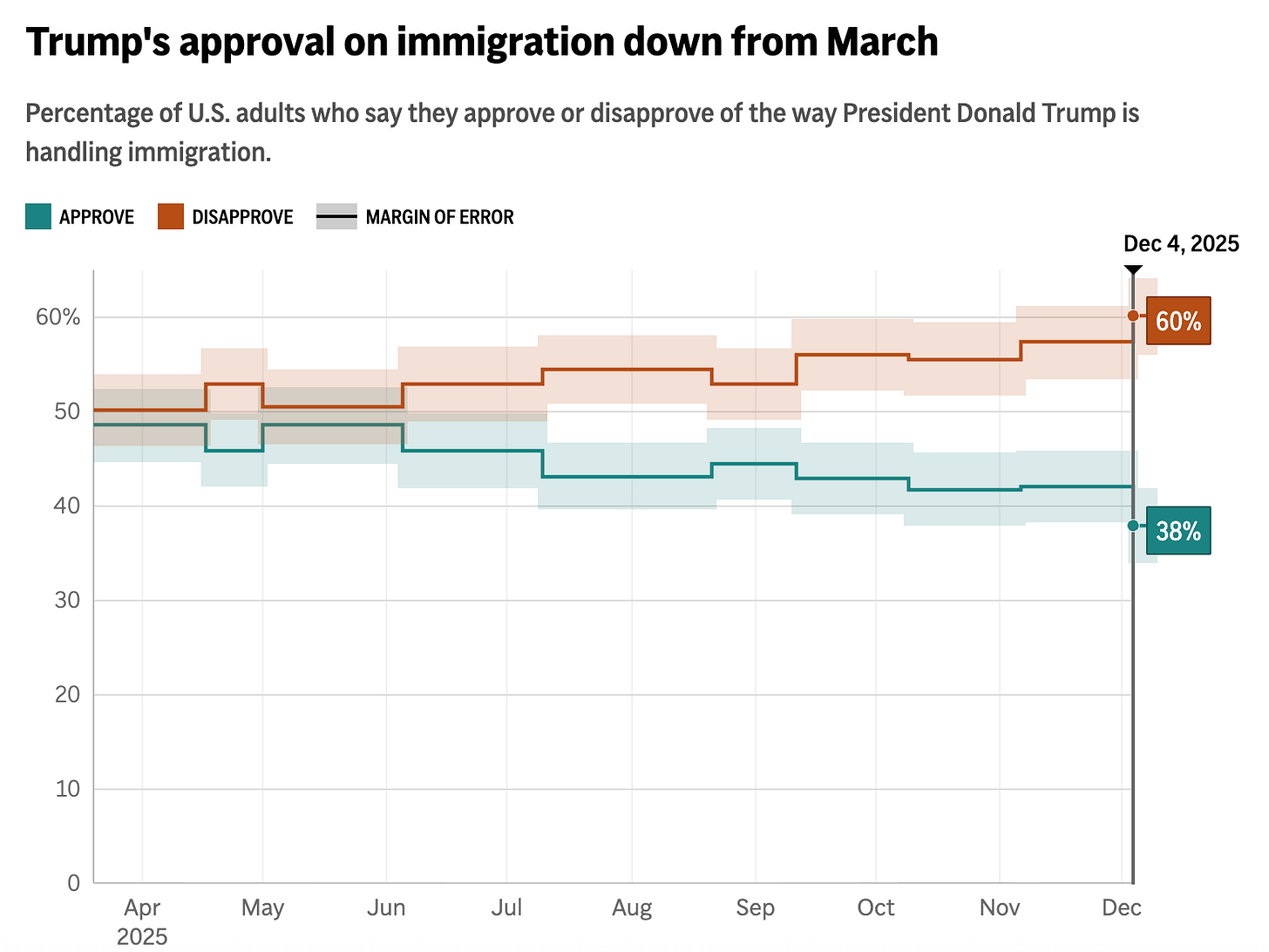 In reality, Trump’s poll numbers are in the toilet on every single issue, including immigration and the economy, which used to be his best issues. Only 31% of U.S. adults now approve of how he’s handling the economy, per an Associated Press poll released Friday, and his approval on immigration has dropped from 49% to 38% since last March. It’s alarming that more than a third of the country see ICE murdering women in the streets and tear gassing 6-month-old babies and think, this is what I voted for, but some people are just incapable of empathy and critical thought.